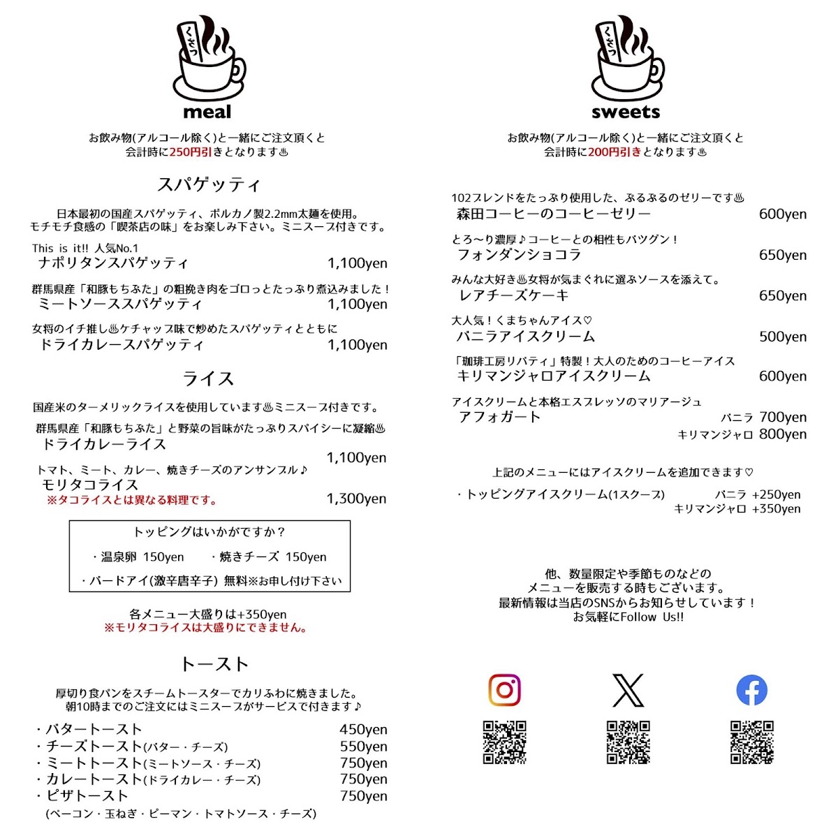 Welcome to Morita Coffee, a charming café nestled in the heart of Kusatsu, Gunma, just a pleasant 10-minute stroll from the city center. This cozy spot invites coffee lovers and casual diners alike to explore its thoughtfully curated menu. Featuring a delightful selection of coffee and beverages, including their renowned siphon coffee, each cup promises a strong and flavorful experience that has won over even the most discerning palates.